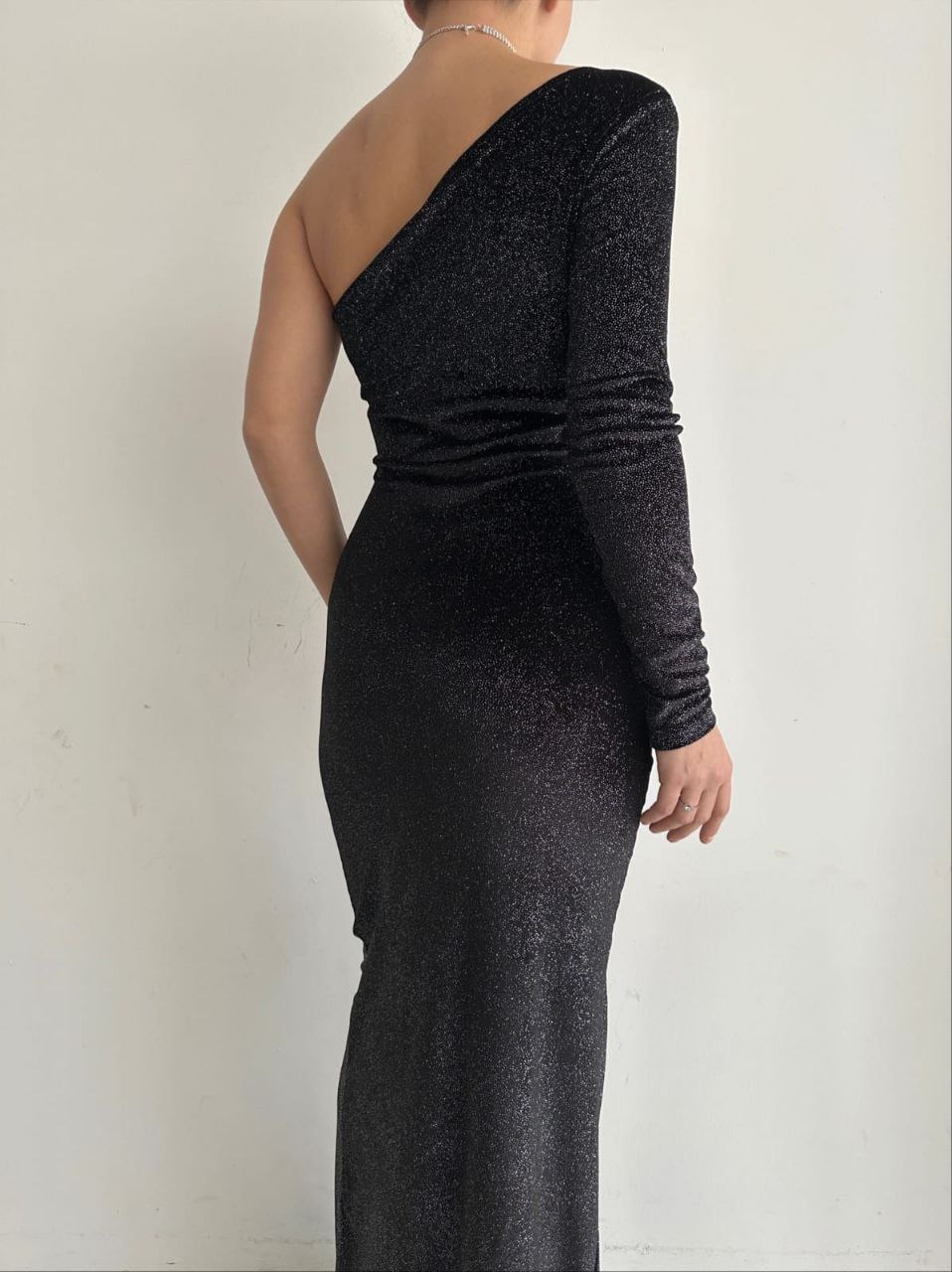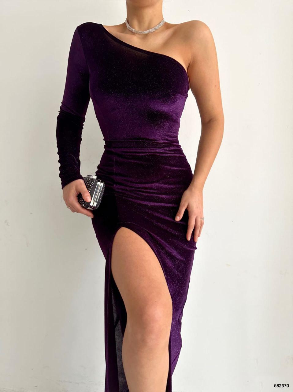 Toptan Bayan Giyim İmalatçıları Wholesale Merter Tekstil Toptancıları Tek Kol Omuz Dekolte Simli Kadife Abiye Elbise – 6 Renk – WGS 582370